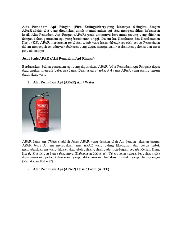 Alat pemadam api ringan apar definisi alat pemadam api ringan apar adalah mudah dilayani untuk satu orang guna memadamkan apikebakaran pada mula terjadi kebakaran definisi berdasarkan permenakertrans ri no 4men1980 tentang syarat syarat pemasangan dan pemeliharaan alat pemadam api ringan. Apar jenis air water adalah jenis apar yang menggunakan meida air dengan tekanan tinggi. Alat pemadam api jenis air water alat pemadam api jenis air merupakan alat pemadam api yang menggunakan air untuk memadamkan api.