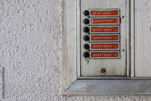 Red Apartment Buzzer Labels On A White Waill Buy This Stock